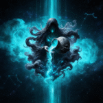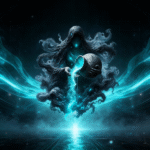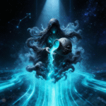 Emerging from deep starlit skies, the celestial figure releases luminous streams of turquoise energy, symbolizing knowledge, creation, and forward motion. The flowing cosmic currents represent ideas in motion — fluid yet powerful, calm yet transformative.