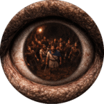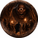 At the heart of the design is a hyper-realistic giant eye, within which you can see Odysseus and his men — standing together, uncertain yet determined, illuminated by torchlight in the darkness of the cave. Every detail reflects the emotional intensity of the moment: