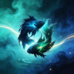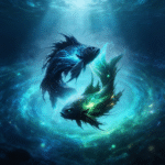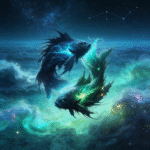 Two celestial fish circle within a luminous spiral of starlit water, symbolizing intuition, emotion, and infinite depth. Flowing blue and emerald energy currents merge seamlessly with the night sky, creating a tranquil yet powerful presence.